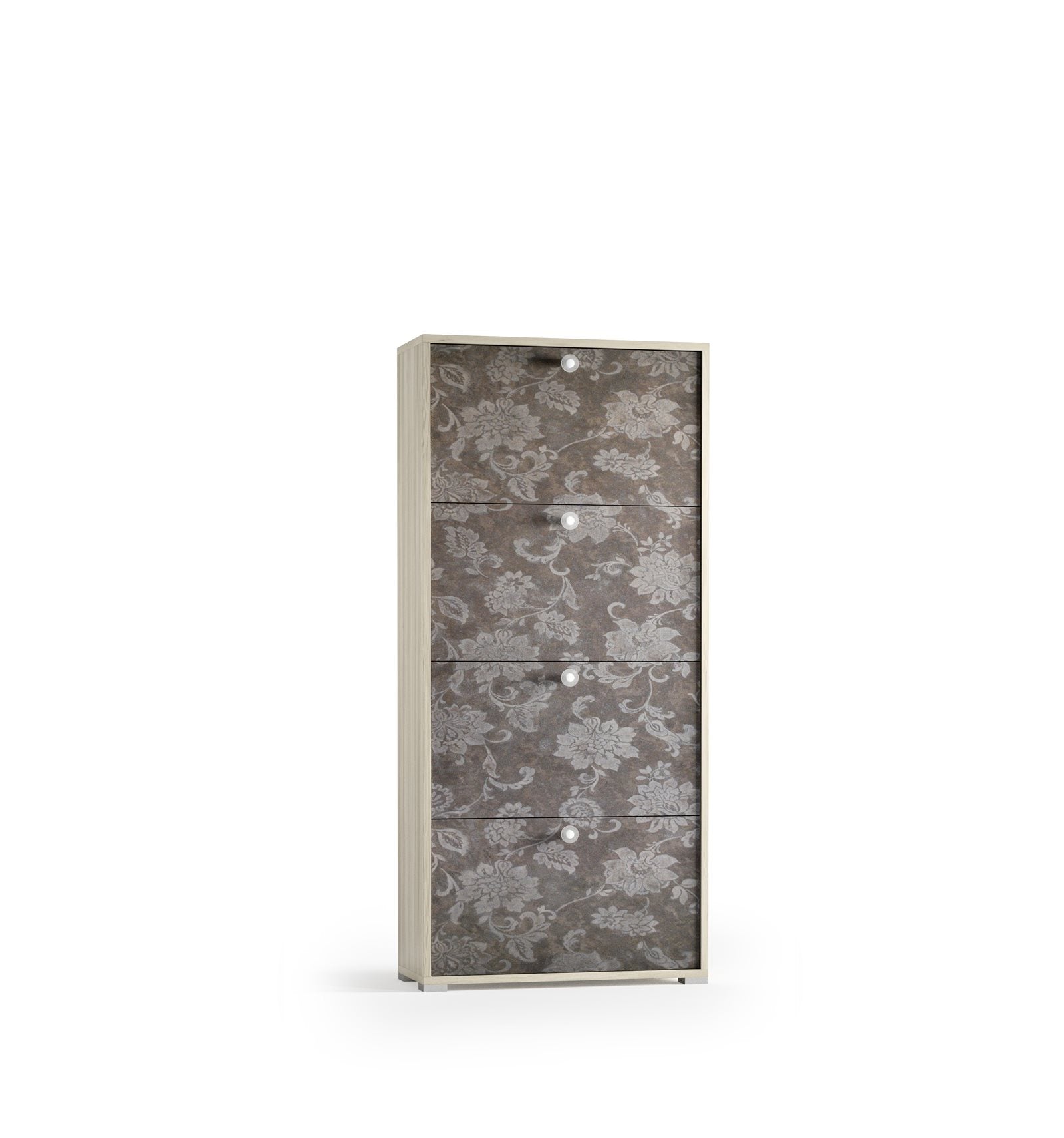 4-türiges Ulmen-/Blumen-Schuhregal mit Blumendekoration und doppeltem Kunststoffbehälter für Schuhe. Dieses Schuhregal ist mit einem ergonomischen Griff und Kunststofffüßen ausgestattet, um Stabilität und Komfort zu gewährleisten. Er bietet Platz für bis zu 18 Paar Schuhe und bietet ausreichend Organisationskapazität für Ihre Garderobe. Seine Abmessungen betragen 67 x 28 x 147 cm (Breite x Tiefe x Höhe) und er wird vollständig in Italien hergestellt.