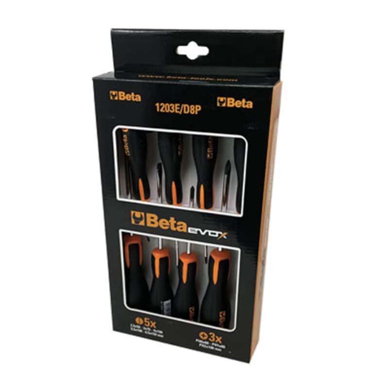 Die Evox Beta CFPZ 8 Series 1203/D8 Schraubendreher aus verchromtem Stahl sind zuverlässige und widerstandsfähige Werkzeuge. Die schwarz lackierte Spitze ist durch eine Phosphatierungsbehandlung vor Oxidation geschützt. Der ergonomische Bi-Material-Griff bietet einen bequemen und sicheren Halt. Der Platzbedarf und die Größe jedes Schraubendrehers sind auf der Kugelkappe des Griffs angegeben. Dieses Set besteht aus 8 Schraubendrehern, darunter 5 Schlitzschraubendrehern (2,5x50; 3x75; 4x100; 5,5x100 und 6,5x150) und 3 Kreuzschlitzschraubendrehern (PH0x60; PH1x80 und PH2x100).