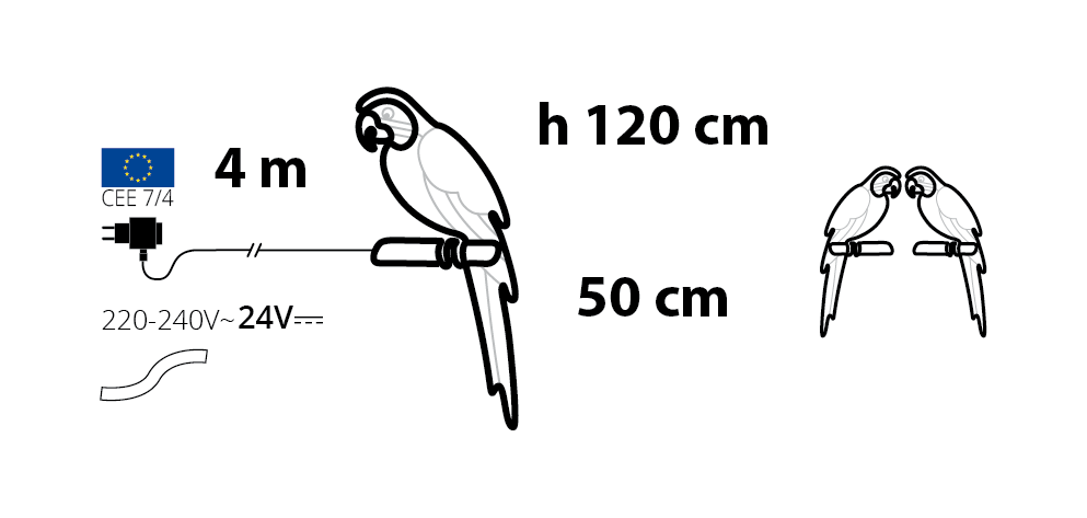Il pappagallo H120cm SMD Neon bifacciale LED Mix4 è un elemento di design elegante e versatile, ideale per feste ed eventi estivi. Con un telaio in metallo verniciato bianco, questa decorazione luminosa può essere installata sia a parete che a terra, utilizzando una base opzionale non inclusa. È abbinabile a basi e accessori della serie LN AC e offre luce fissa grazie a un trasformatore da 24V. È progettato per l'uso sia esterno che interno e dispone di un cavo di alimentazione bianco lungo 4m. Le dimensioni sono di 50xH120cm e viene fornito in una scatola bianca con etichetta colorata, con imballi misti dei modelli. Include 2 versioni sinistra e destra (XKC Art. LN M PRT 472-F X).