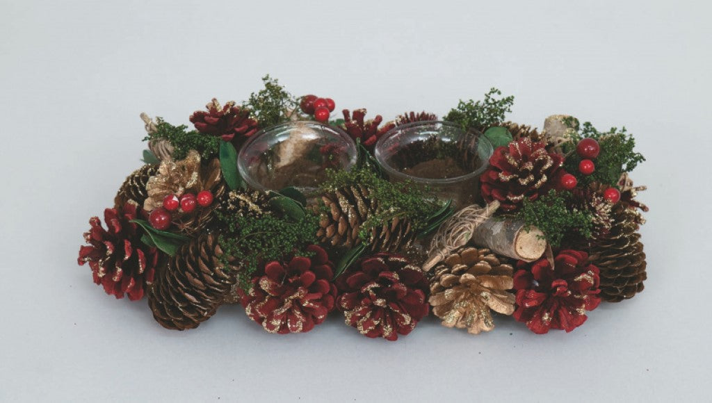Portacandele con bulbo in vetro e decorazione di pigne e bacche