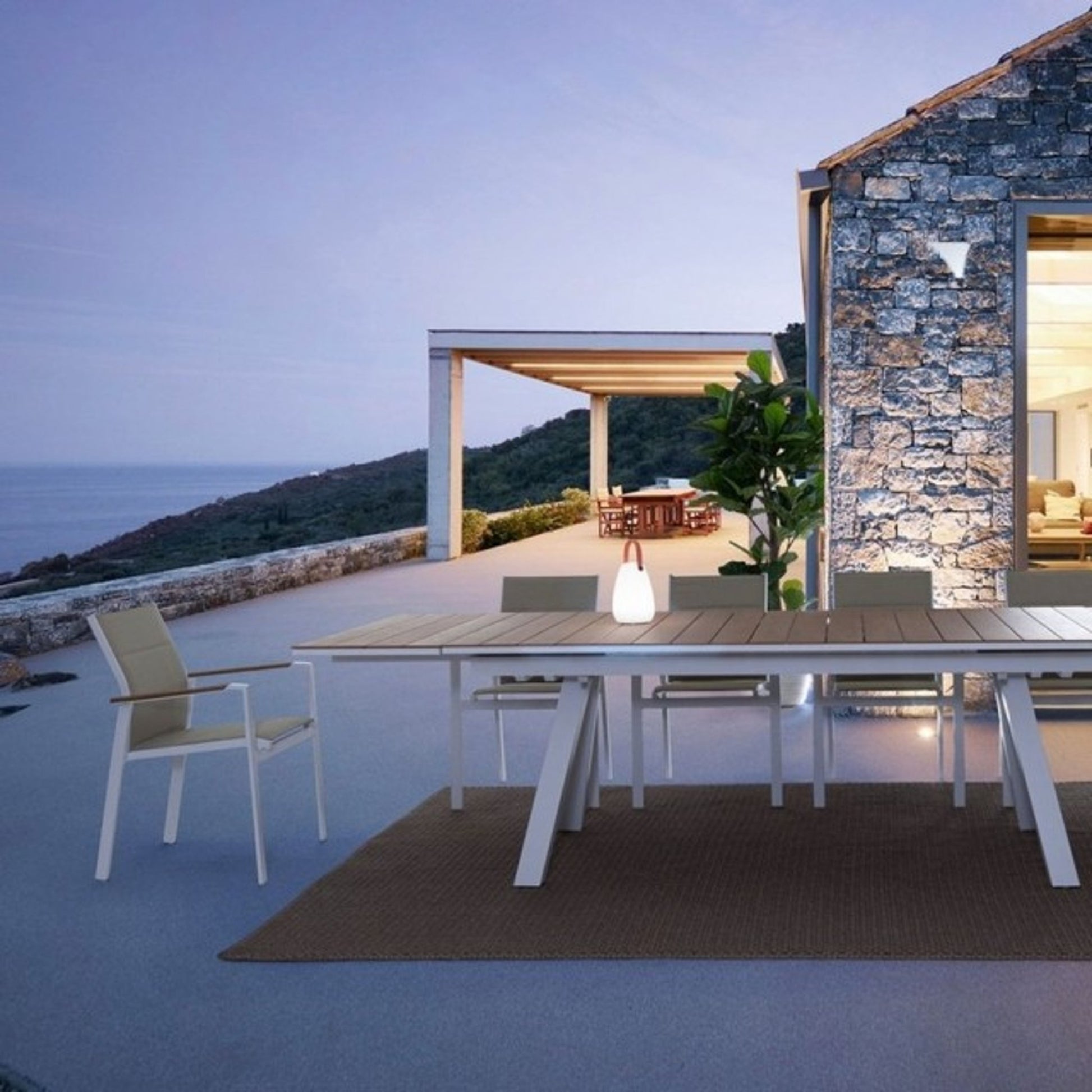 La sedia con braccioli Kubik in colore bianco presenta una struttura in alluminio verniciato a polvere (poliestere) per garantire resistenza e durabilità. I braccioli sono dotati di inserti in polywood, un materiale composito che simula l'aspetto del legno. La seduta e lo schienale sono rivestiti in textilene 2x1 con imbottitura, offrendo comfort e traspirabilità. La sedia è impilabile, facilitando lo stoccaggio e l'ottimizzazione dello spazio.