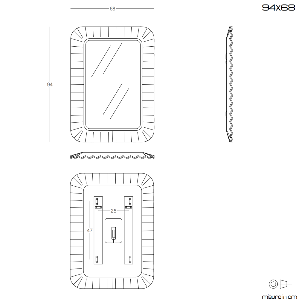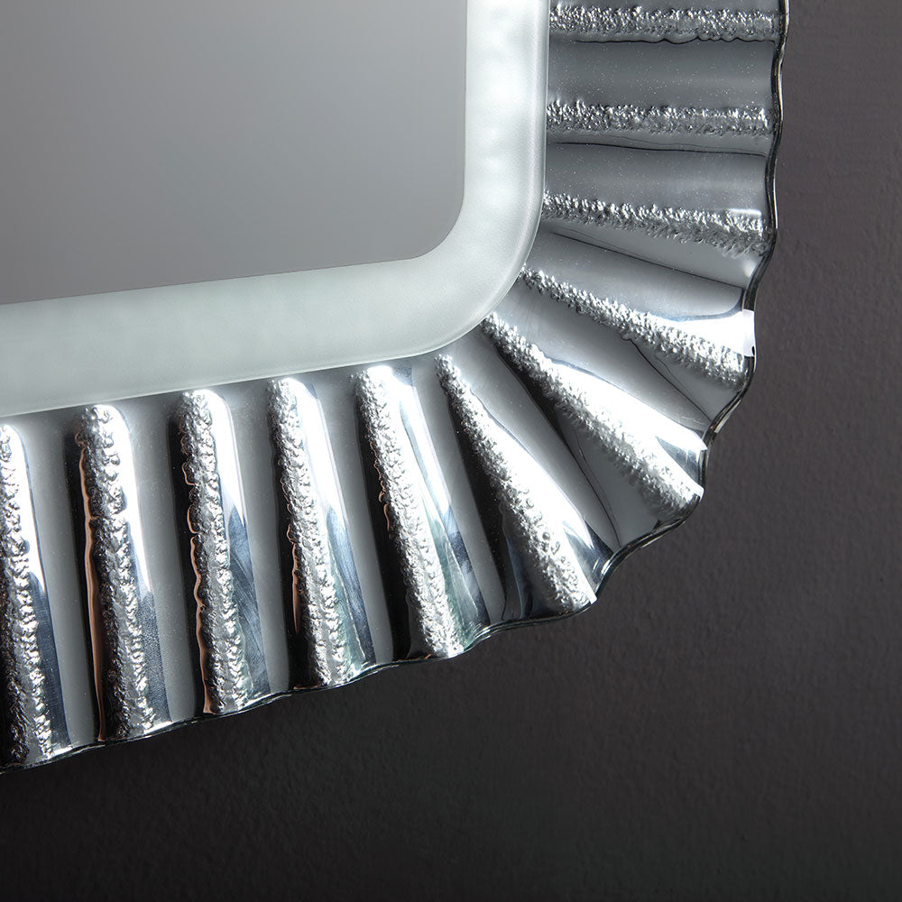 Il nuovo specchio con cornice in vetrofuso argento con decorazione ondulata si caratterizza per l'aspetto moderno e ricercato. Lo specchio da parete che vi presentiamo è ad installazione reversibile. La superficie riflettente è ancorata ad un telaio perimetrale in pvc color alluminio. La cornice è composta in vetro fuso, un'antica tecnica di lavorazione del vetro che permette di creare infinite forme. L'illuminazione a led, integrata, ha un grado di protezione IP44, che consente un utilizzo in sicurezza dello specchio anche in bagno.