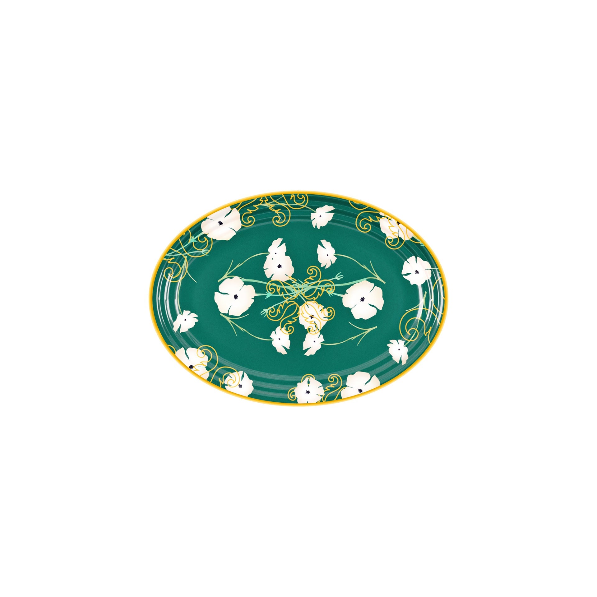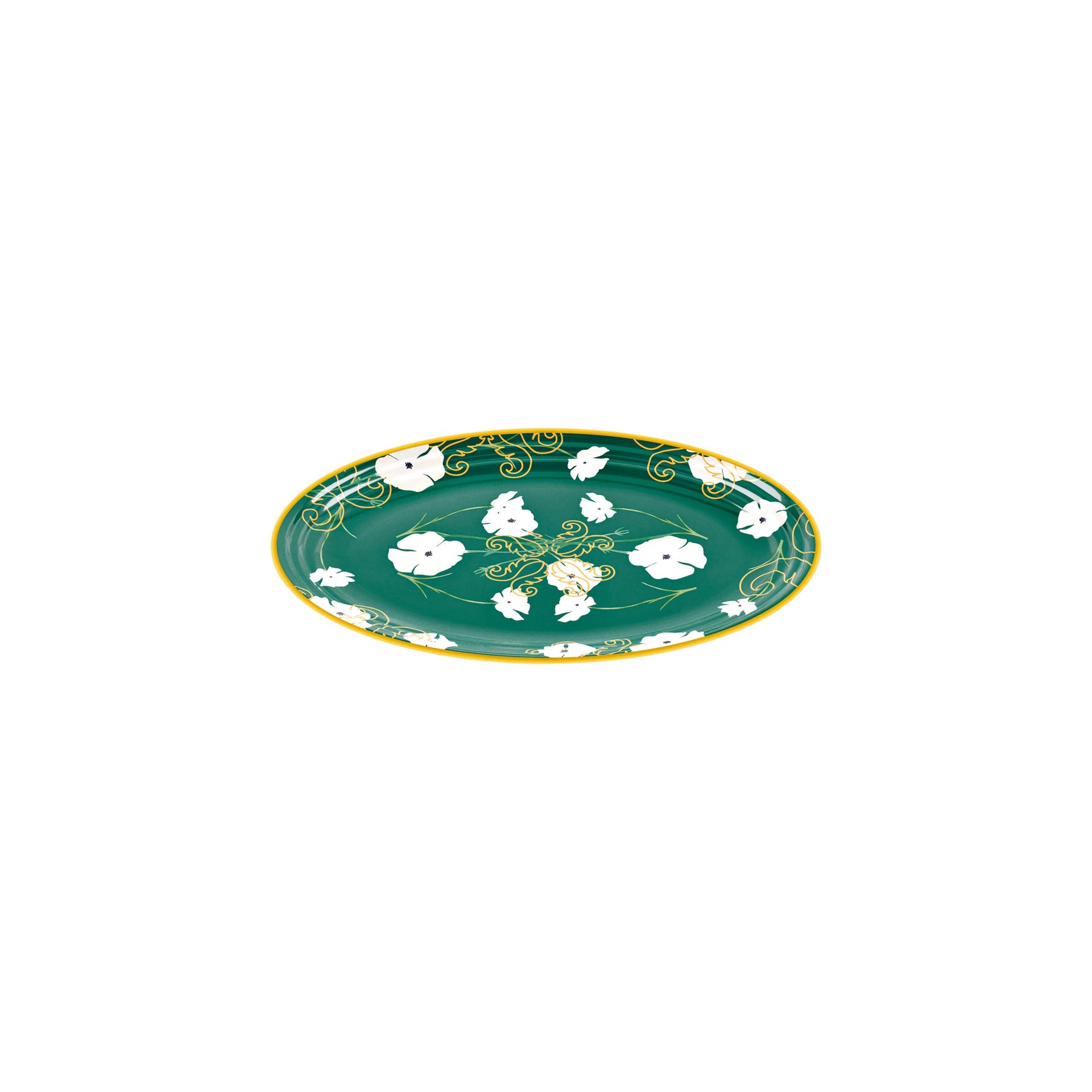 Porta stile e funzionalità sulla tua tavola con il vassoio ovale piccolo Fusion, caratterizzato da un’originale combinazione di colori e dettagli grafici: il verde intenso, il bianco dei fiori e l’oro dei segni decorativi conferiscono un aspetto elegante, adatto a qualsiasi stagione e occasione. Realizzato in melamina resistente, il vassoio offre alta resistenza agli urti e agli shock termici, ed è versatile per ogni contesto: dai pranzi formali alle occasioni informali in casa o all’aperto. Leggero e maneggevole, è anche facile da pulire, essendo lavabile in lavastoviglie.