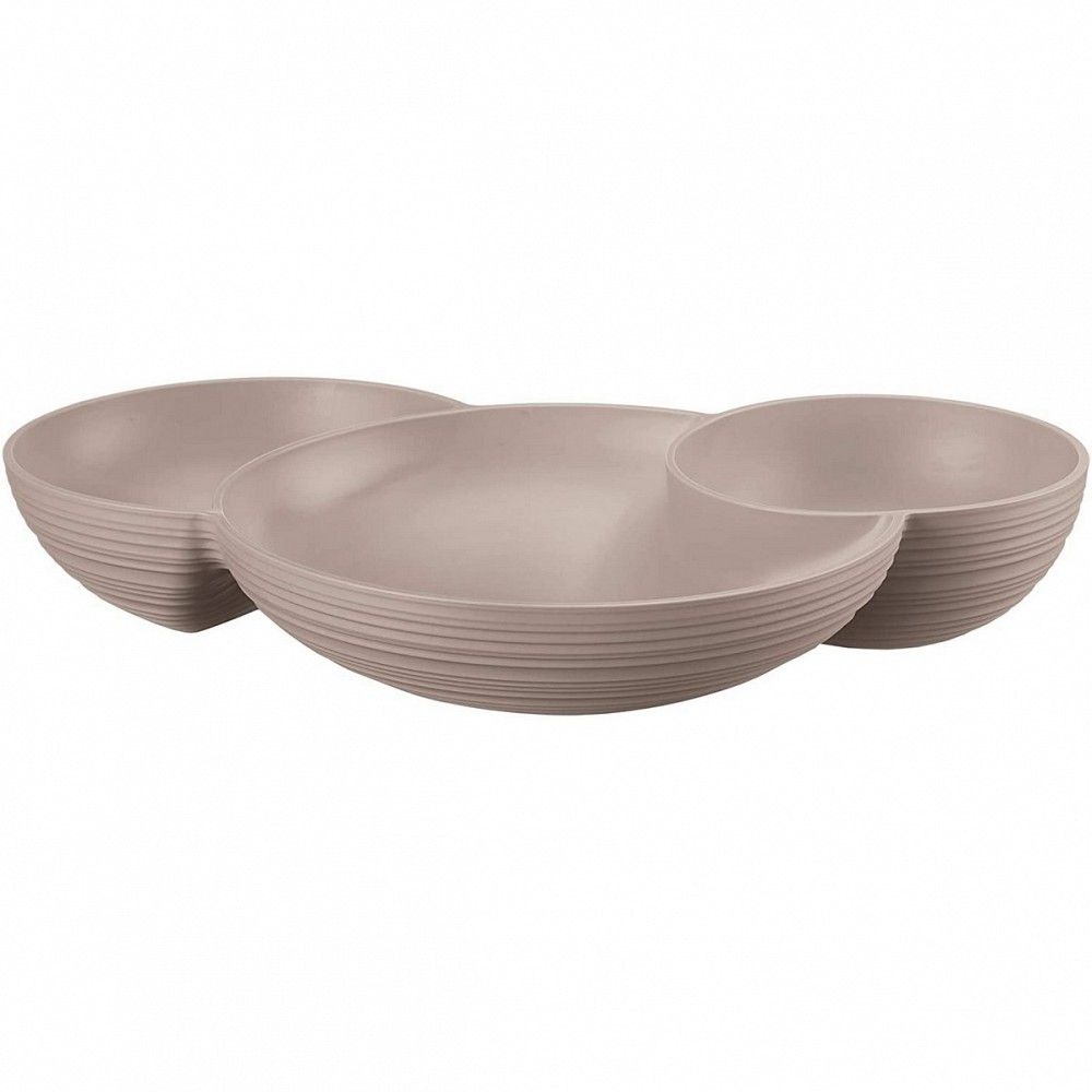 - El plato de entremeses se divide en tres recipientes que pueden acomodar cacahuetes y aceitunas, verduras frescas en juliana y deliciosos trozos de queso;