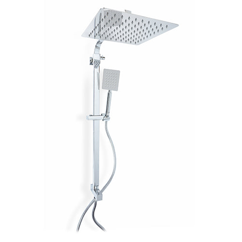 Columna de ducha en acero inoxidable AISI 304, latón y acero cromado. Rociador de 25x25 cm en acero inoxidable AISI 304 pulido. Ducha de mano Diam.8x10 cm en acero inoxidable AISI 304 pulido. Varilla telescópica con accesorios ajustables. Desviador con 1/2 toma de agua.