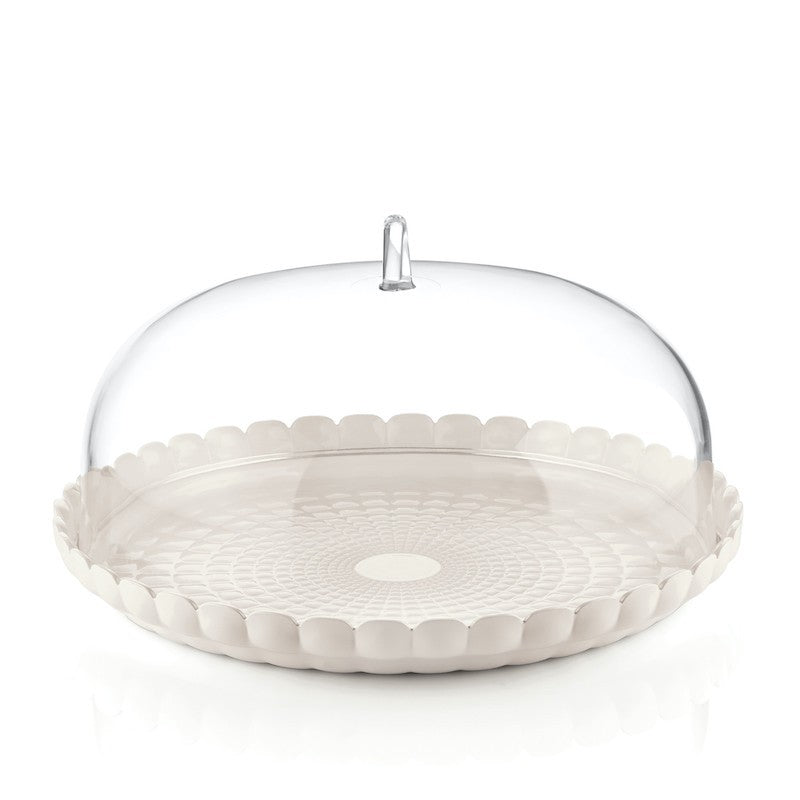 caracterizado por una campana con una superficie lisa y una placa hecha con el distintivo patrón de cuadros en relieve de Tiffany. El plato de doble cara le permite contener pasteles blandos en el lado con el borde elevado y pasteles secos o tartas en el lado plano.