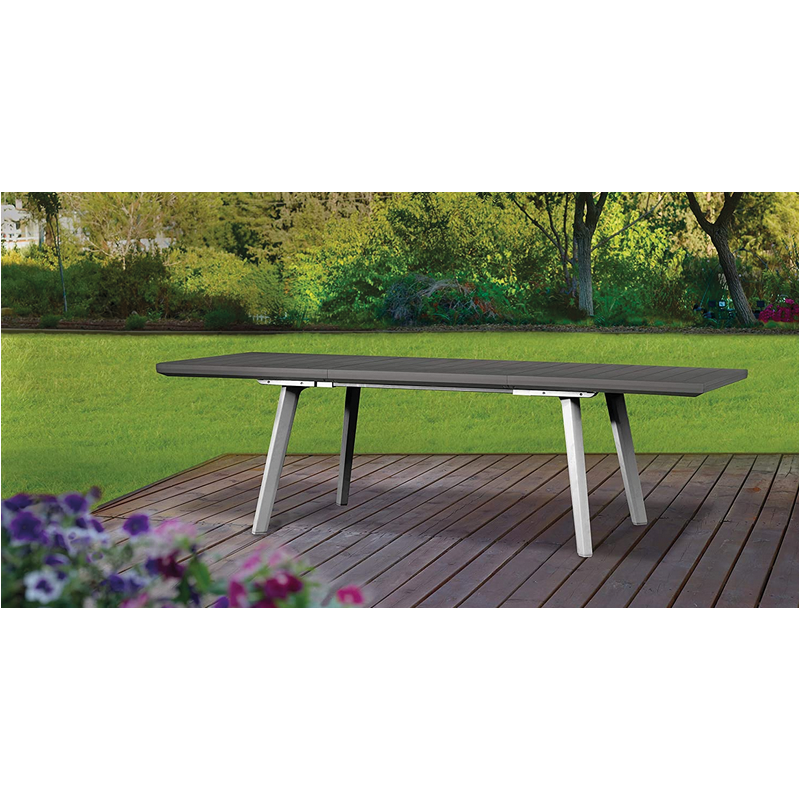 Realizada con una estructura lineal y con lamas con acabado efecto madera, la Mesa Extensible Harmony otorga un aspecto único a cualquier jardín o terraza.
