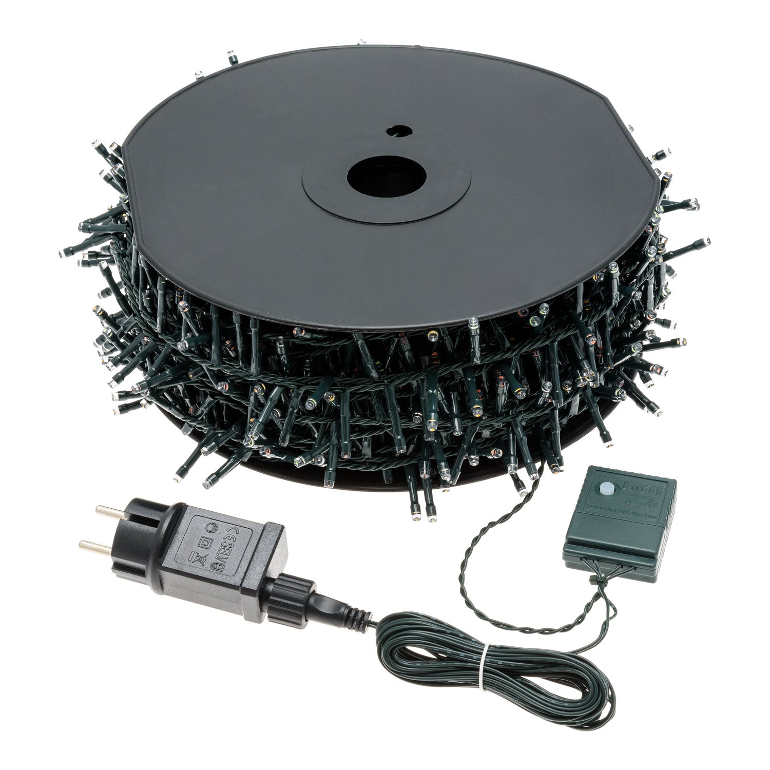 Cadena Lineal MiniCluster Cinta Ø6cm NTL 2000 LED MULTICOLOR Ø5mm Reflex, Temporizador Memoria Controlador 8 juegos de luces seleccionables con Temporizador On-Off 8-16 horas apagable mediante Botón de Luz, Transformador de Baja Tensión, Uso Exterior, Cable Verde, Dimensiones 4+ 40,5m , Bobina de plástico rígido incluida, Caja color Luxury (XKC Art. LED NTL 2000-C).