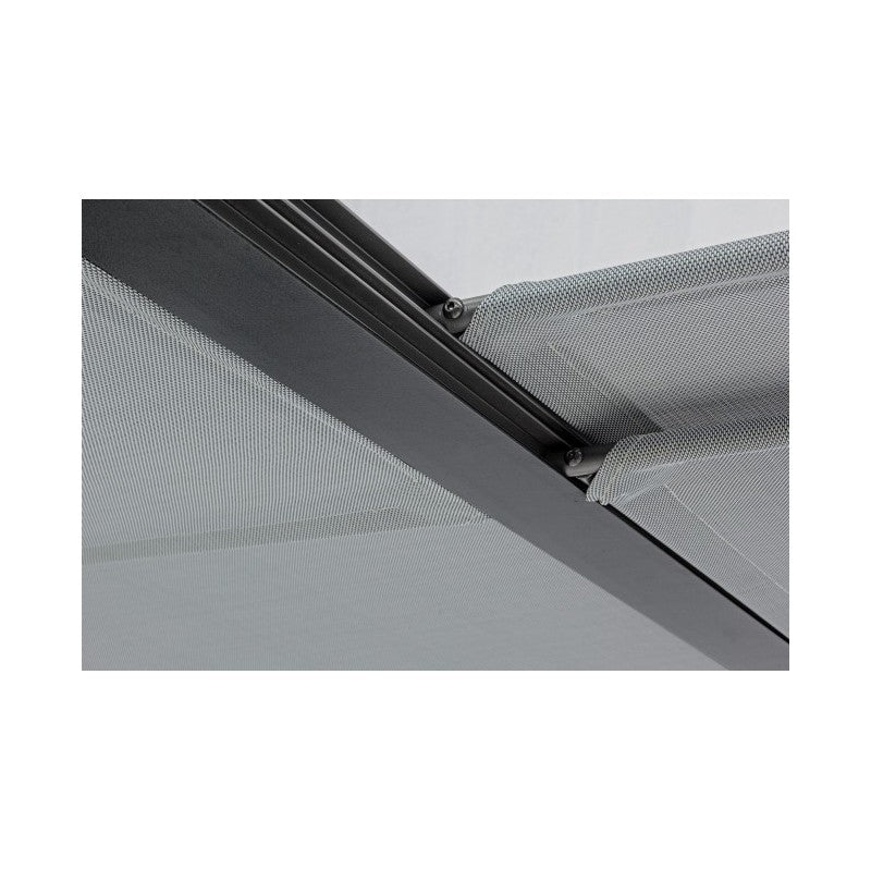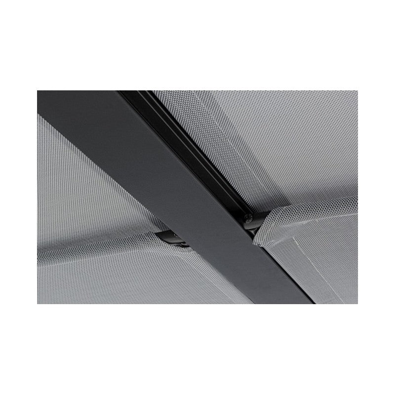 Estructura de aluminio pintado a polvo (poliéster). Postes de 65x65mm, toldo superior deslizable de textilene gris oscuro. Requiere montaje.
