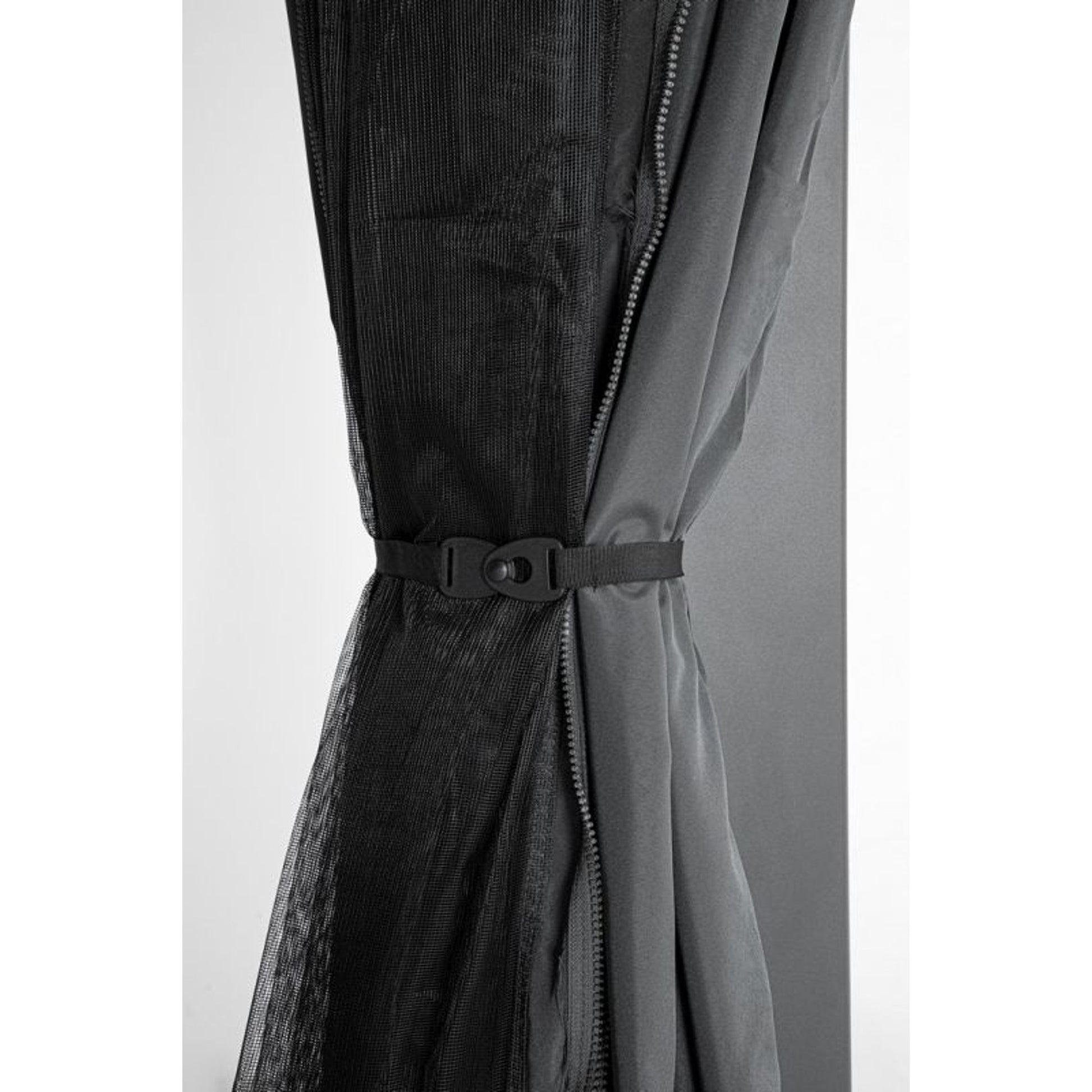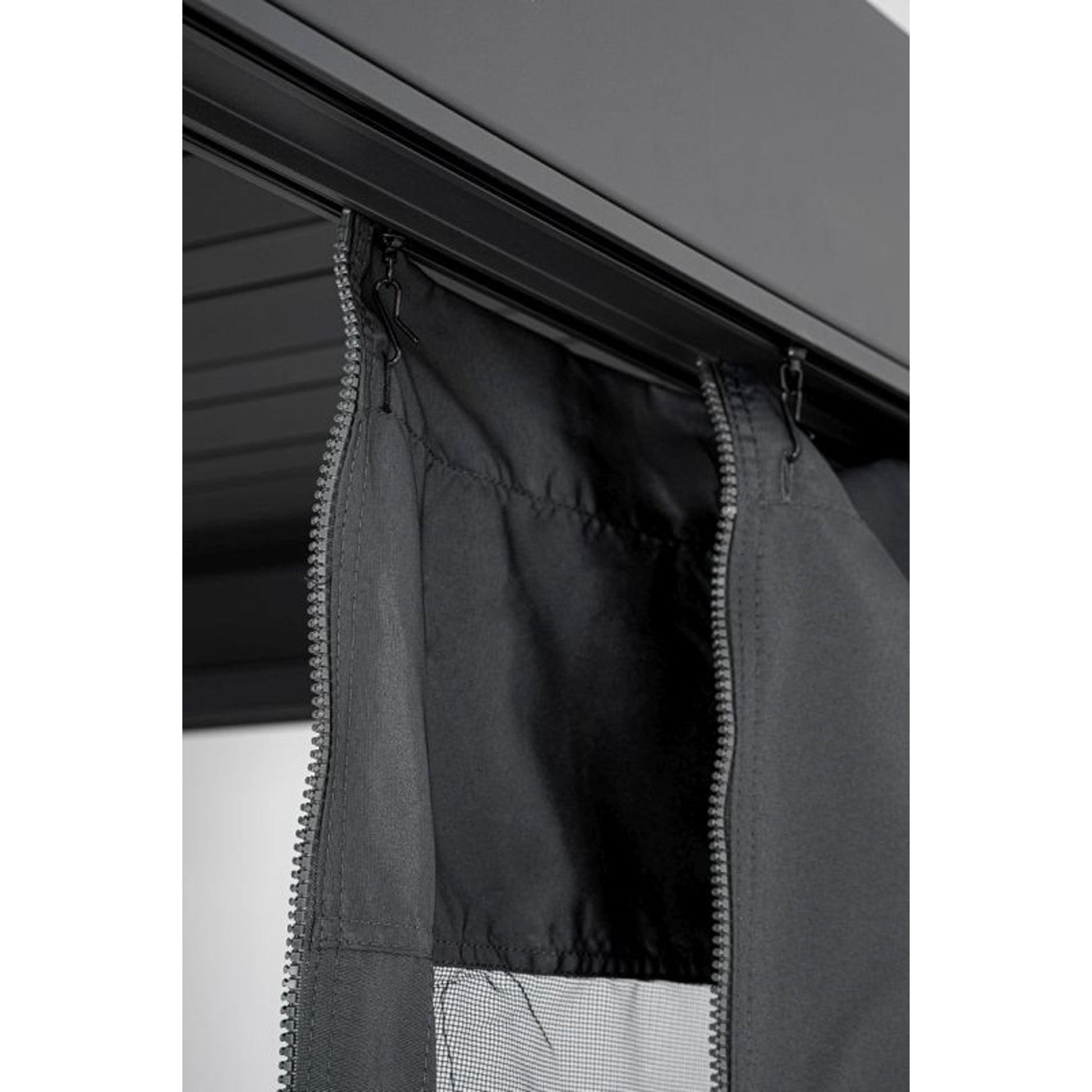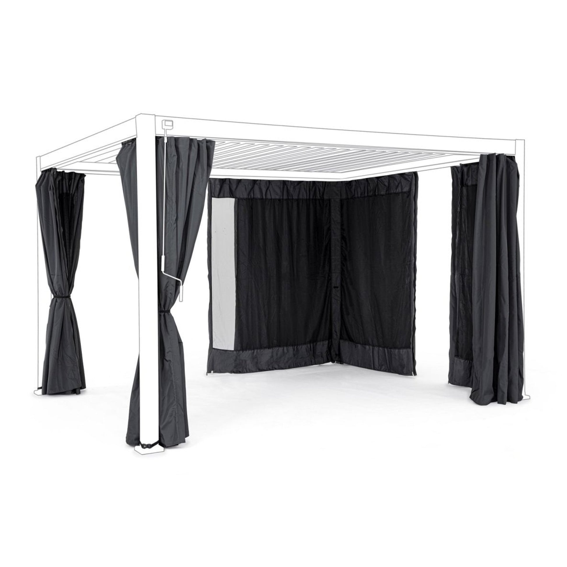 I teli angolari (forma a elle) sono realizzati in poliestere 180gr/m², mentre le zanzariere sono in poliestere 70gr/m². Il set include binari in alluminio da fissare alla pergola con viti autoforanti. Ogni telo e zanzariera è dotato di cerniere per garantire la chiusura totale del perimetro della pergola. Il peso totale del prodotto è di 25,46 kg e il brand è Bizzotto. Le misure sono 344a - 238h (x4).