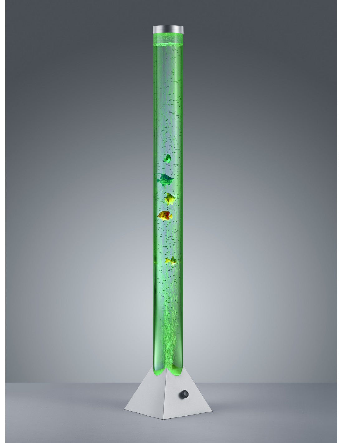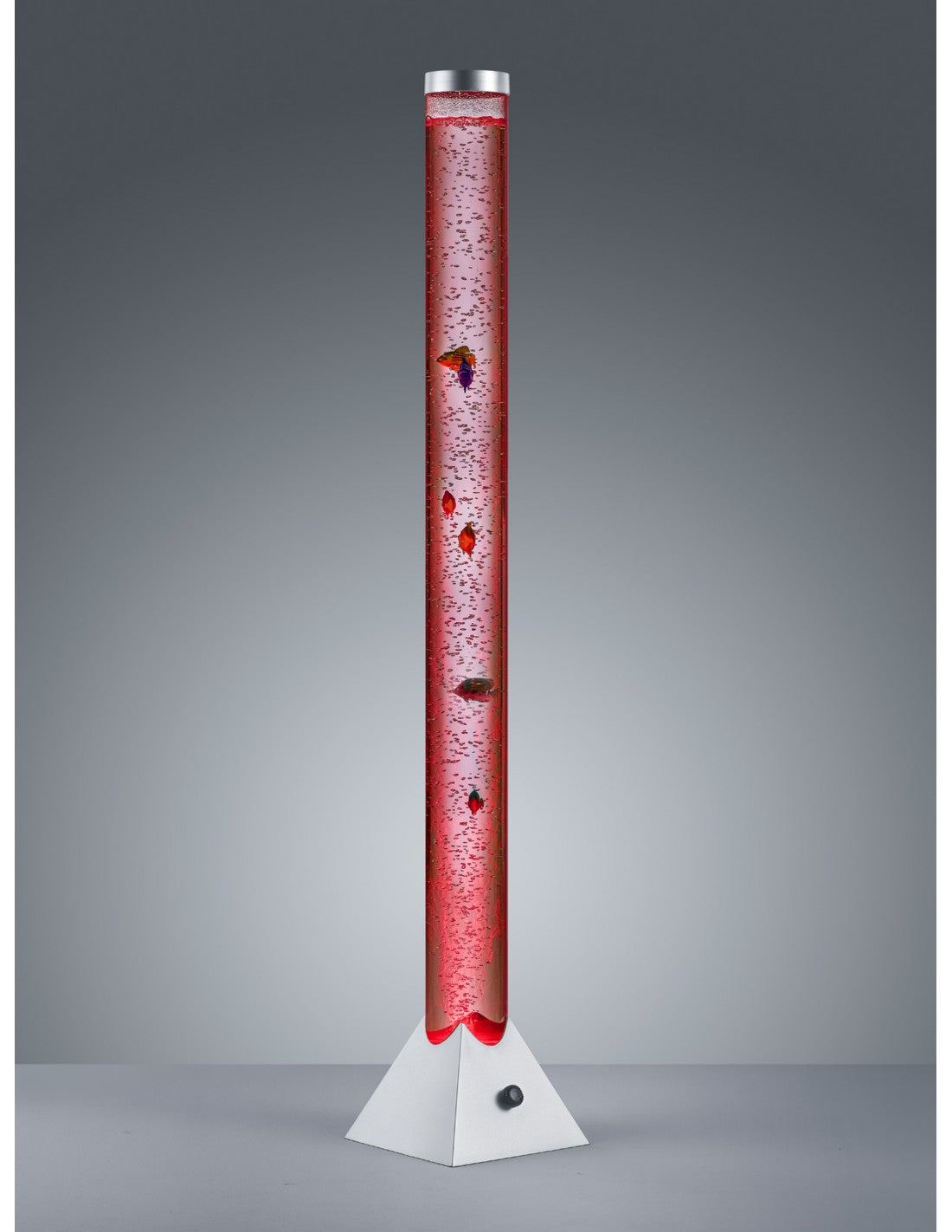 La lampada da terra MOTION di Trio Lighting è composta da una struttura cilindrica in plastica finitura titano e diffusore in plastica trasparente, interruttore a filo incluso. All'interno del diffusore cilindrico pesciolini colorati galleggianti.