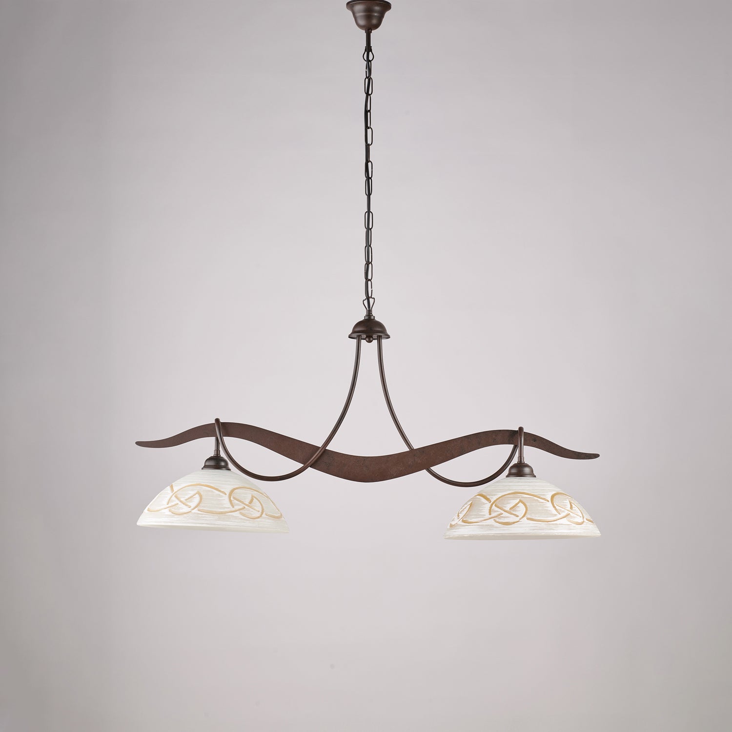 Lampadario in ferro laccato nero con decorazione effetto ruggine e diffusori in vetro diametro 30 bianchi e ambra 2 luci H.46 - MAX 106 - L. 89 X 30