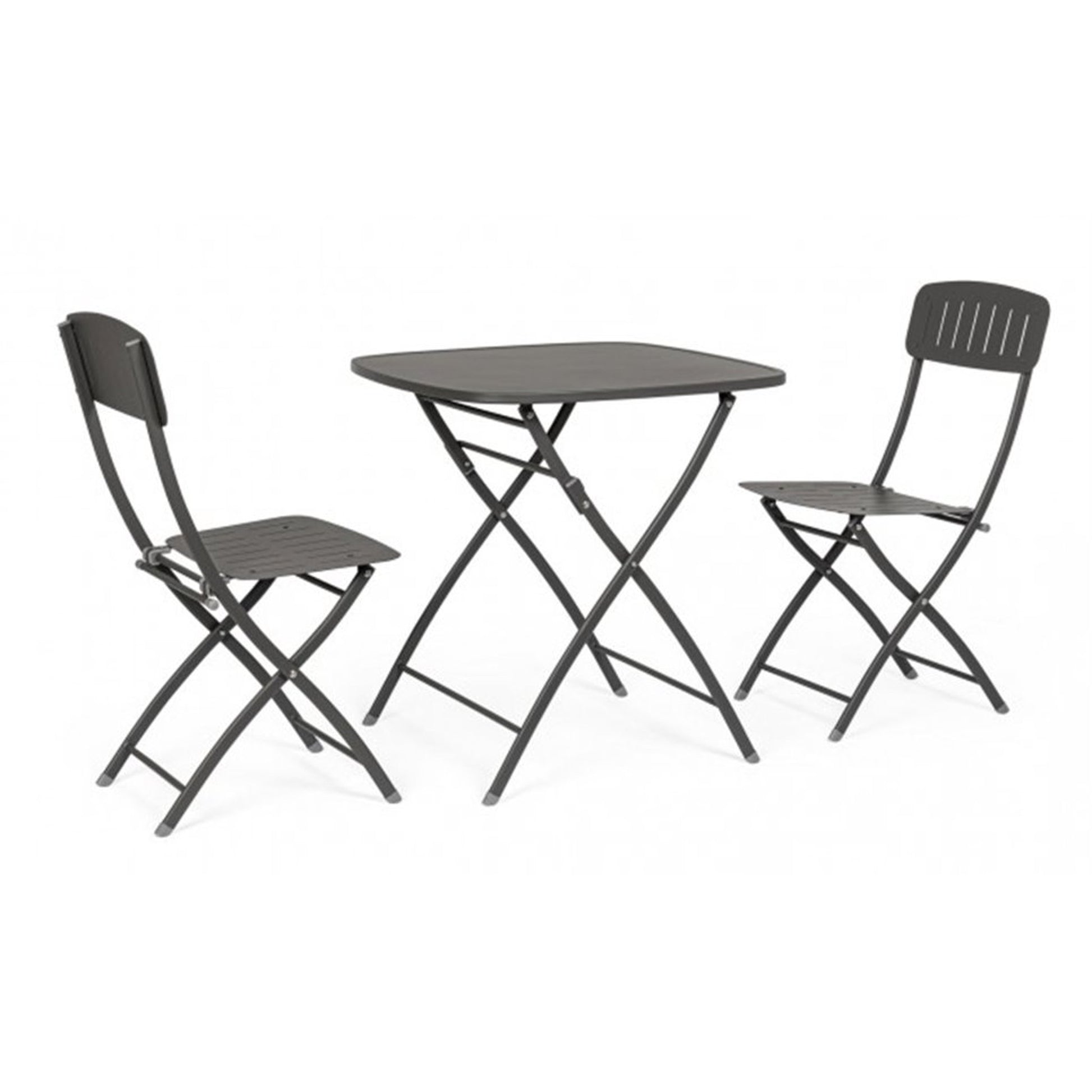 Set di 3 pezzi bistrot in antracite, ideale per l'esterno. La struttura è realizzata in acciaio trattato con e-coating e verniciato a polvere in poliestere, con una finitura opaca. Questo set è pieghevole, rendendolo pratico e facile da riporre. Le dimensioni dei tavoli sono: A: 44a - 50b - 85h - 44h1; C: 70a - 70b - 71h cm.