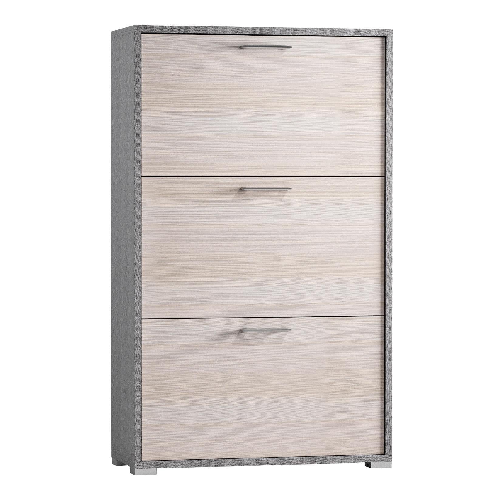 Slim shoe cabinet in texil color and modern larch front made of melamine wood 3 flap doors, measures 65x18x112 cm maximum capacity 9 pairs of shoes.
