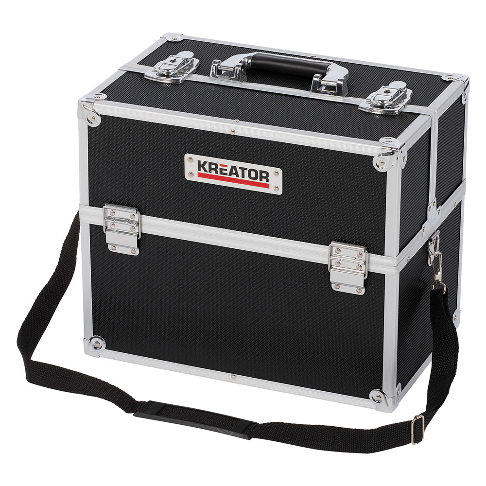 In alluminio, struttura altamente robusta ed estremamente leggera. Con divisori rimovibili, 4 vassoi a sbalzo, cerniere in metallo. Chiusura con chiave, cinghia a tracolla. Angoli rinforzati.